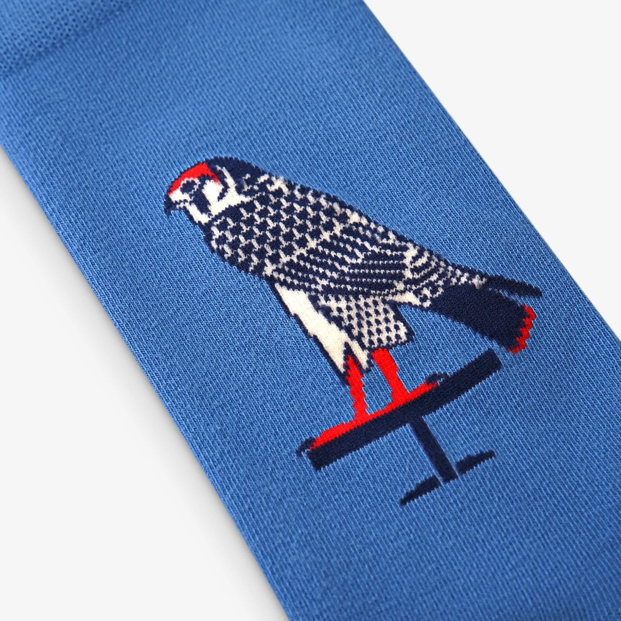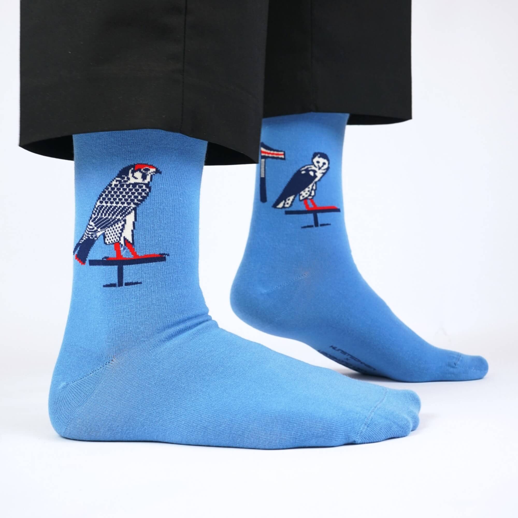 Entdecke 'Ägyptische Vögel', Teil einer exklusiven Zusammenarbeit zwischen Kunstsokken und dem Reichsmuseum der Altertümer in Leiden. Dieses Design erzählt die Geschichte des Sarkophags des Peftjauneith durch die Augen zweier heiliger Vögel – des Falken und der Eule.